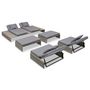 Grace au rotin synthetique resistant aux intemperies et a l'eau, l'ensemble de mobilier d'exterieur est facile a nettoyer, resistant a l'usure et adapte a un usage quotidien. L'ensemble de salon comporte un cadre en acier laque robuste et durable. Les dossiers du divan-lit double et des canapes peuvent etre ajustes pour la position la plus confortable. Les coussins et les oreillers epais et amovibles s'ajoutent au confort de couchage et d'assise. La grande chaise longue peut accueillir 2 personnes et vous pouvez garder a portee de main sur les cotes vos boissons, telephones, livres ou autres objets. L'ensemble est leger et modulaire et peut etre dispose de differentes manieres pour s'adapter a tous les decors.
