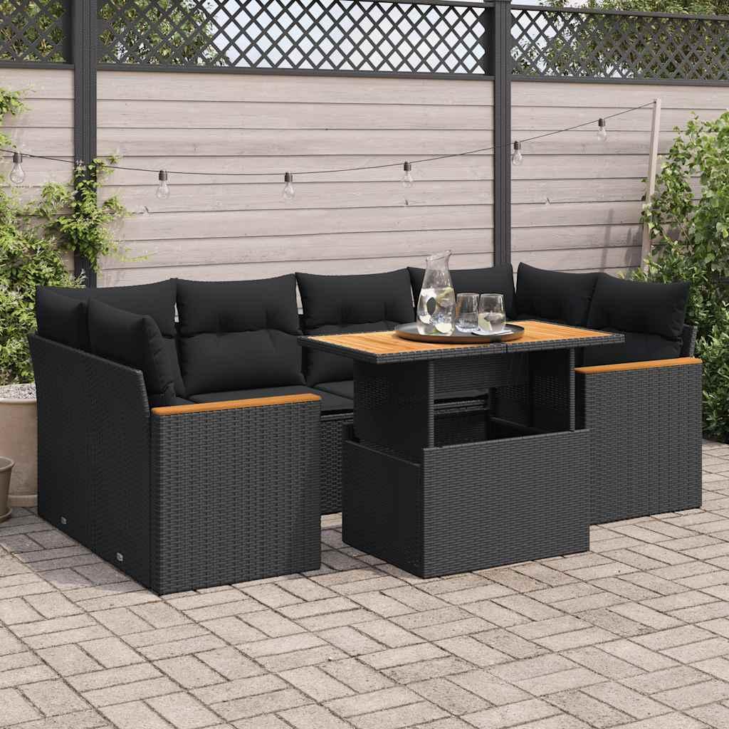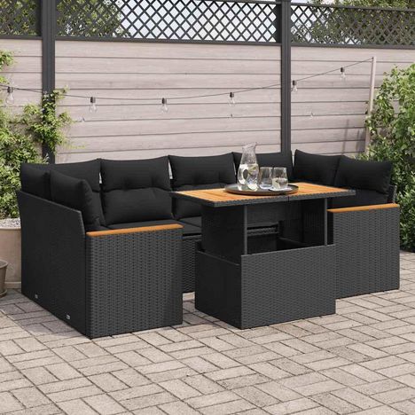 Salon de jardin 6 pcs avec coussins noir resine tressee acacia