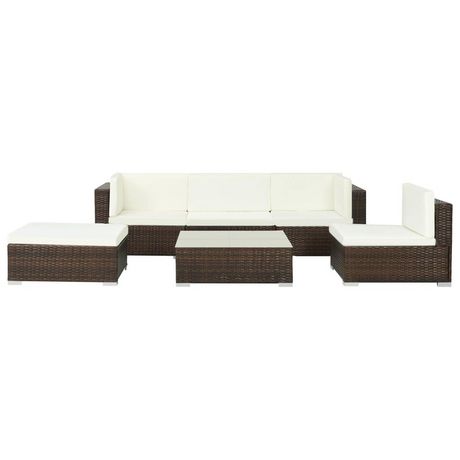 Cet ensemble de canapes en resine tressee, compose de 2 canapes d'angle, 2 canapes centraux, 1 table basse, 1 pouf, 6 coussins de dossier et 5 coussins de siege, offrira un coin salon elegant pour votre jardin ou votre terrasse.