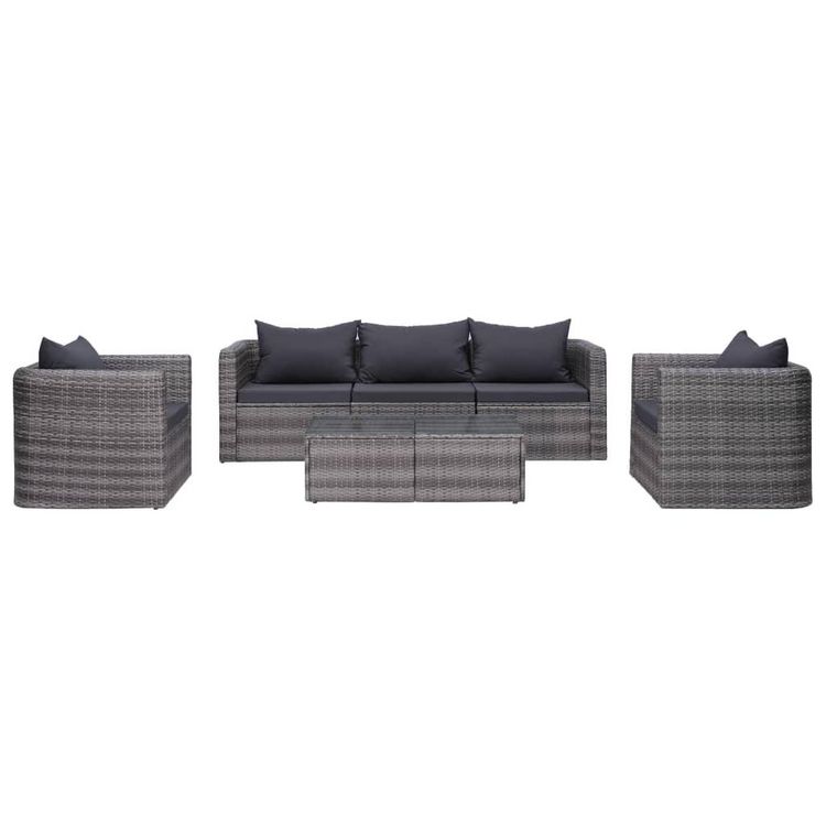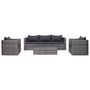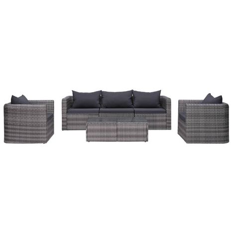 Cet ensemble de canapes en resine tressee, compose de 2 canapes d'angle, d'1 canape central, de 2 canapes simples, d'1 table basse, de 5 coussins de siege et de 5 oreillers de dossier, vous offrira un espace genereux et un style contemporain pour votre jardin ou patio.