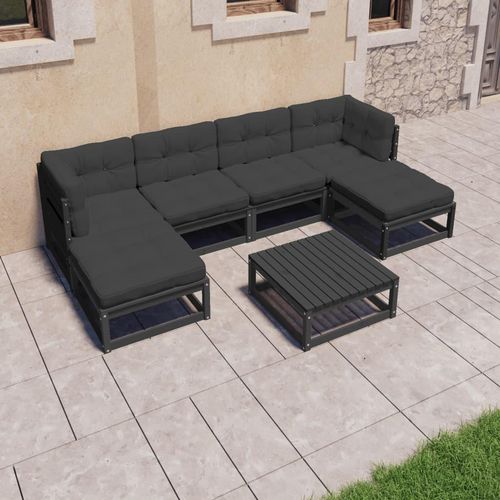 Salon de jardin 7 pcs avec coussins noir bois de pin massif