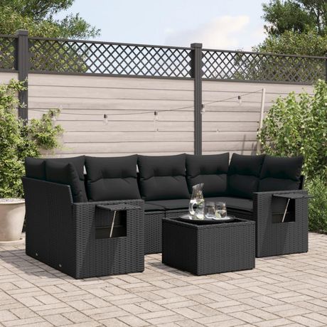 Salon de jardin 7 pcs avec coussins noir resine tressee