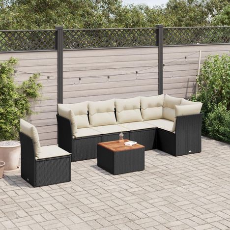 Salon de jardin 7 pcs avec coussins noir resine tressee