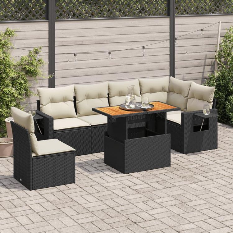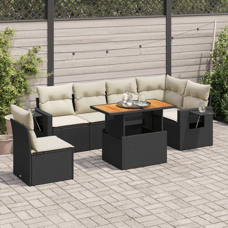Salon de jardin 7 pcs avec coussins noir resine tressee