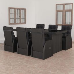 Cet ensemble de meubles de jardin est dote d'un cadre robuste en acier enduit de poudre, tres stable et durable. La resine tressee rend cet ensemble de salle a manger facile a nettoyer, resistant a l'usure et adapte a une utilisation a l'exterieur. Le dessus de table en verre est facile a nettoyer avec un chiffon humide. Les chaises inclinables offrent le plus grand confort d'assise et un excellent soutien. Le dossier est facilement reglable selon votre desir en utilisant le bouton au cote. De plus, les coussins d'assise et de dossier epais et moelleux sont egalement tres confortables.