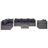 Cet ensemble de canapes en resine tressee, comprend 3 canapes d'angle, 2 canapes centraux, 1 canape a un e place, 1 table basse, 6 coussins de siege et 9 oreillers de dossier, offre un espace genereux et reste aussi moderne avec une touche de alte pour votre jardin ou patio.