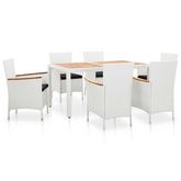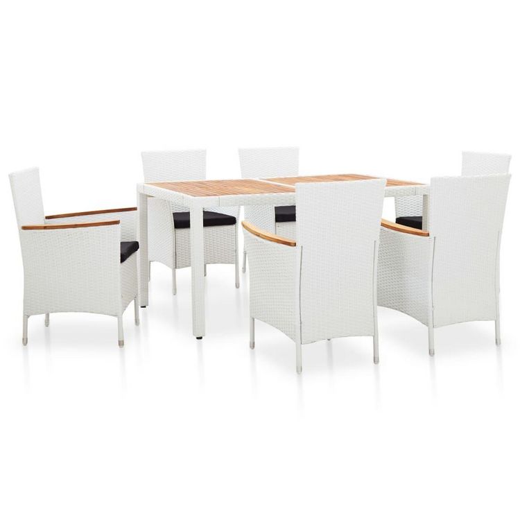 Fabrique en resine tressee resistante aux intemperies et impermeable, l'ensemble de salle a manger est facile a nettoyer, resistant a l'usure et adapte a un usage quotidien. Les cadres en acier enduit de poudre rendent la table et les chaises fortes et robustes. Le dessus de table et les accoudoirs sont en bois d'acacia massif, un bois dur tropical, resistant aux intemperies. Grace a leur construction legere, tous les articles sont faciles a deplacer. Les coussins de siege epais, doux et remplis de mousse sont tres confortables et fabriques en polyester hydrofuge. Les housses de coussin a fermeture eclair peuvent etre facilement retirees et lavees. Cet ensemble de meubles est facile a assembler.