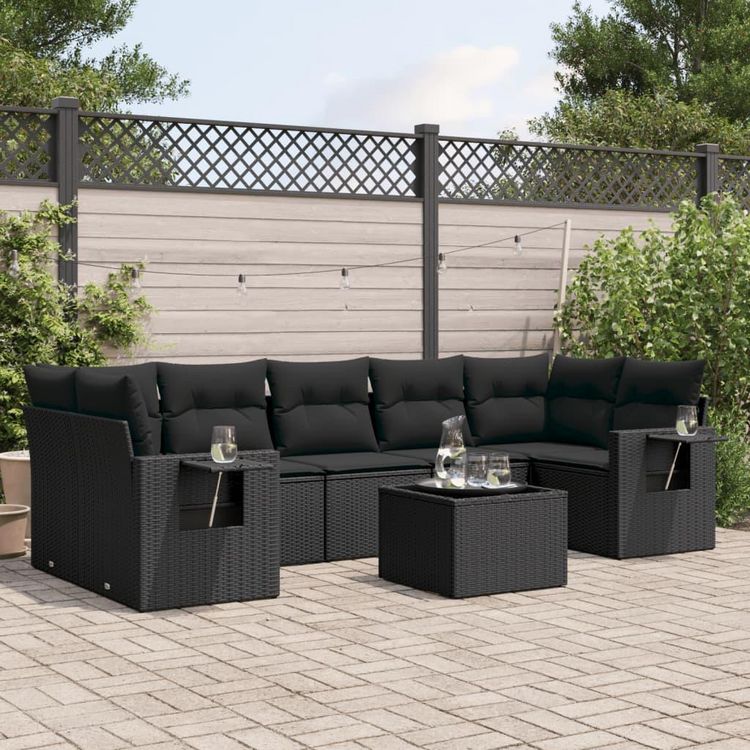 Salon de jardin 8 pcs avec coussins noir resine tressee