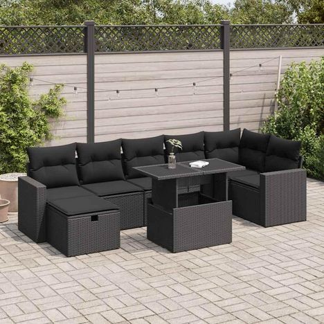 Salon de jardin 8 pcs avec coussins noir resine tressee