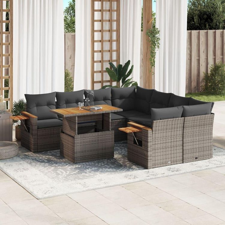 Salon de jardin 9 pcs avec coussins gris resine tressee