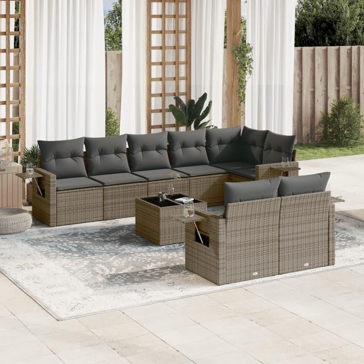 Salon de jardin 9 pcs avec coussins gris resine tressee