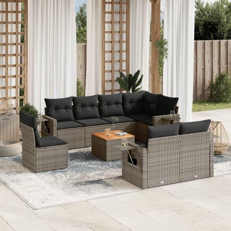 Salon de jardin 9 pcs avec coussins gris resine tressee