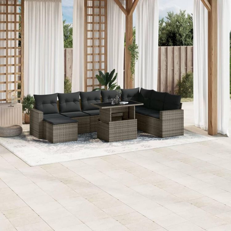 Salon de jardin 9 pcs avec coussins gris resine tressee