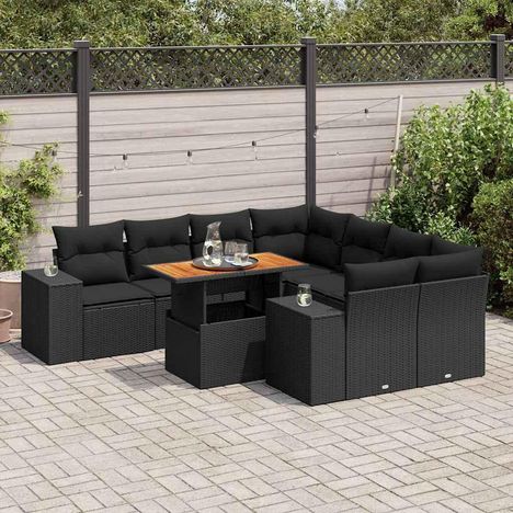 Salon de jardin 9 pcs avec coussins noir resine tressee