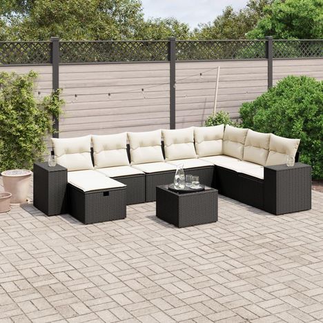 Salon de jardin 9 pcs avec coussins noir resine tressee