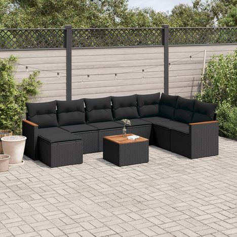 Salon de jardin 9 pcs avec coussins noir resine tressee