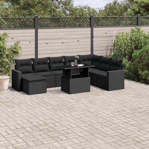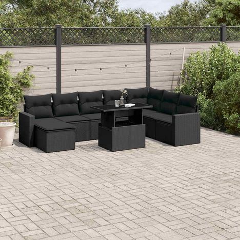 Salon de jardin 9 pcs avec coussins noir resine tressee