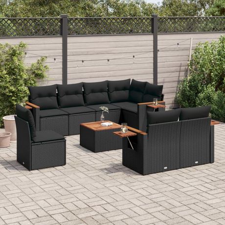 Salon de jardin 9 pcs avec coussins noir resine tressee
