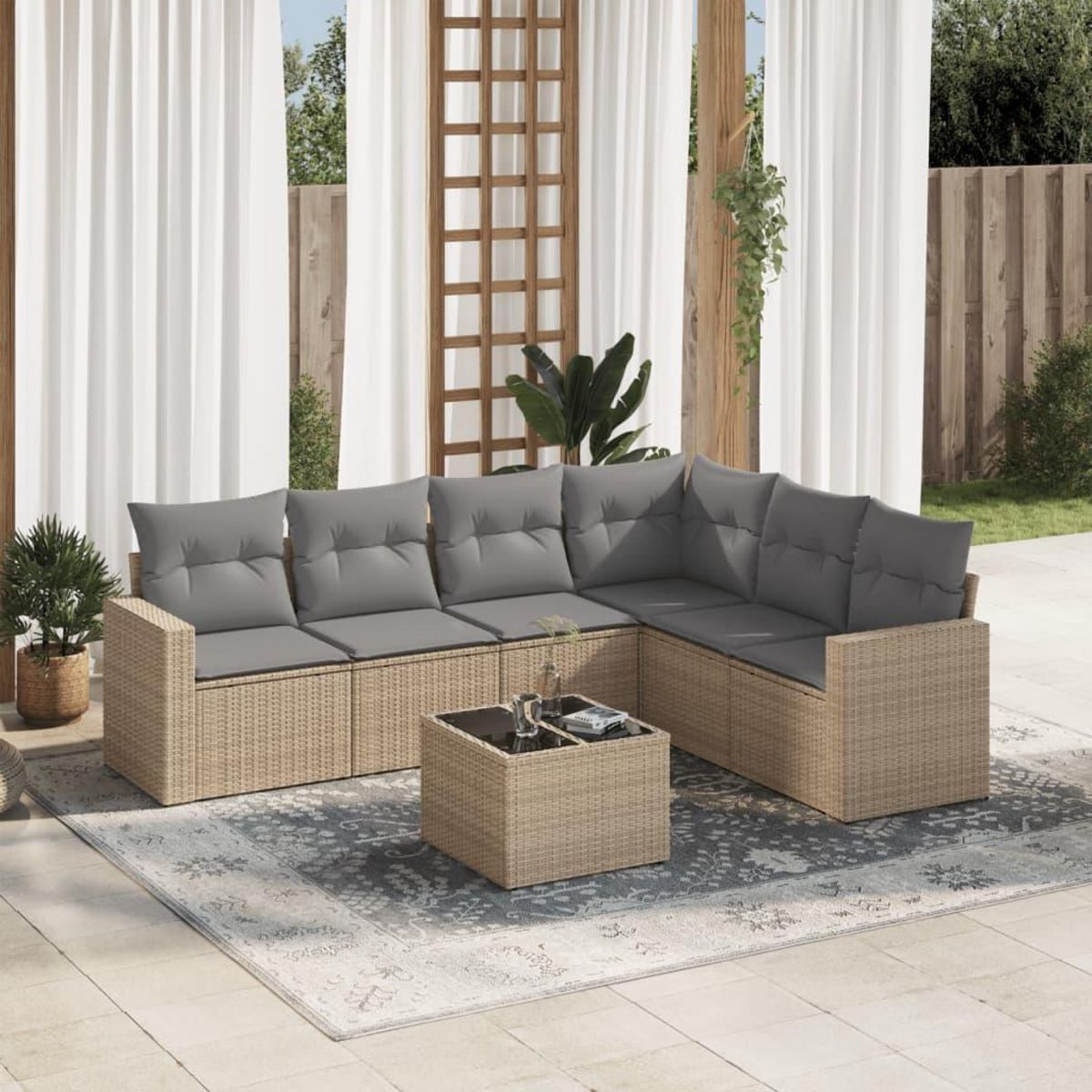 Salon de jardin avec coussins 7 pcs beige resine tressee