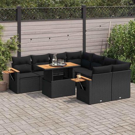 Salon de jardin avec coussins 9 pcs noir resine tressee acacia