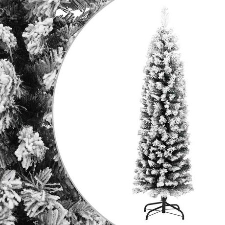 Notre sapin de Noël artificiel mince, avec de la neige blanche floquee, forme la piece maîtresse de vos decorations de Noël, creant une ambiance de Noël unique ! Ce magnifique sapin de Noël en PVC est tres realiste dans sa forme et son apparence. Les pieds en acier ajoutent a sa stabilite. L'arbre d
