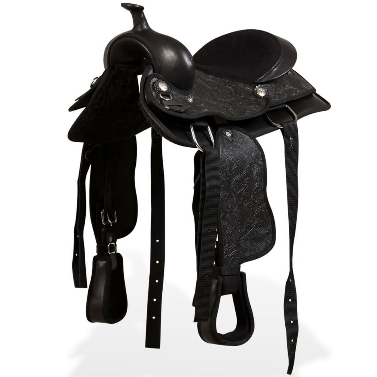 Le cuir veritable de haute qualite et le cuir synthetique qui est decore avec gaufrage floral font la selle decorative ainsi que fonctionnelle. La selle western est renforcee a tous les points de pression pour une durabilite accrue. Les etriers en cuir sont robustes et solides, tout comme la billette et la sangle. Cette selle est tres confortable pour que le cheval et le cavalier puissent passer de longues heures sur la piste.