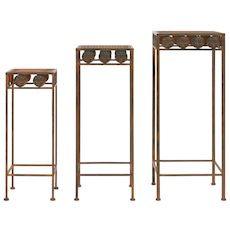 Les supports de plantes sont en metal avec une finition rouillee d'aspect antique et de beaux details decoratifs, ce qui donnera a votre maison une ambiance d'elegance. La livraison comprend 3 supports de differentes tailles. Pour gagner de la place, les supports de plantes gigognes peuvent etre ranges l'un en dessous de l'autre.