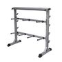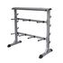 Ce porte-halteres est conçu pour garder les poids libres et les halteres organises et hors sol. Il convient a la plupart des tailles et des styles d'halteres, y compris le neoprene et la fonte. Le cadre stable et les deux etageres vous aideront a maintenir un environnement de gym a domicile plus propre en fournissant un endroit pour garder vos halteres lorsqu'ils ne sont pas utilises.