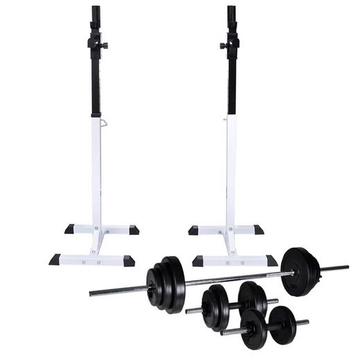 Ce support d'halteres / de flexion des jambes robuste avec un ensemble d'halteres et poids est ideal pour l'entraînement des jambes et au developpe couche dans votre salle de sport a domicile. Support d'halteres stable : ce support d'halteres stable convient aux barres d'halteres d'environ 45 a 50 m