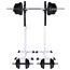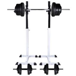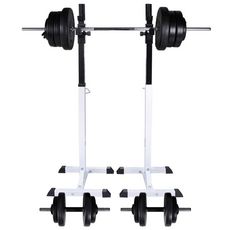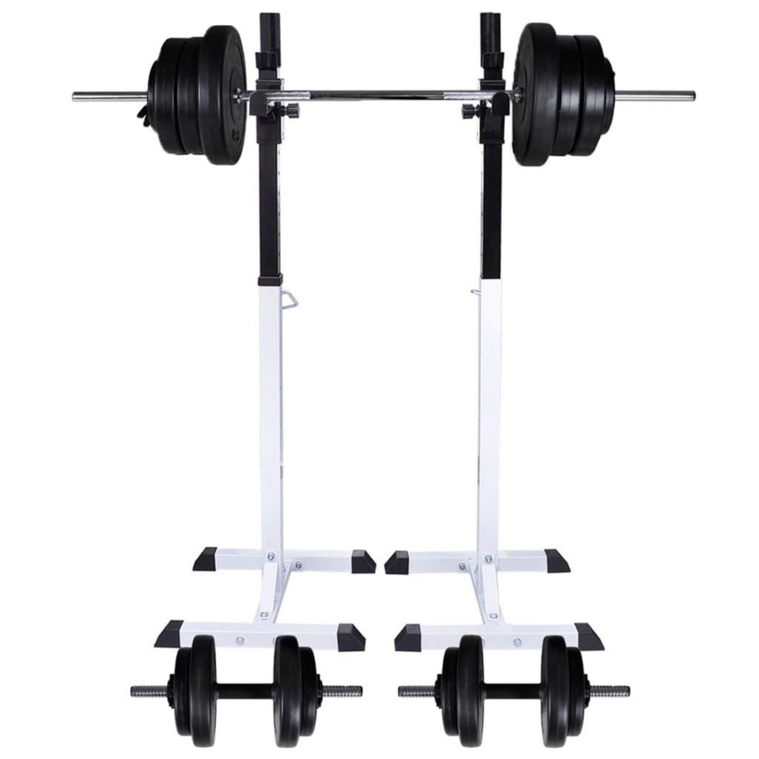 Ce support d'halteres / de flexion des jambes robuste avec un ensemble d'halteres et poids est parfait pour votre salle de sport a domicile ! En combinaison avec un banc d'entraînement, il conviendra aussi bien a l'entraînement au developpe couche qu'a la flexion des jambes.