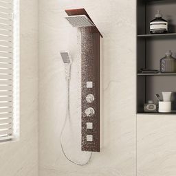 Ce systeme de panneaux de douche multifonctionnel a un design elegant et fera un excellent accessoire a votre salle de bain. La tour de douche est faite de verre de haute qualite avec une belle impression de grain de bois. Elle a trois fonctions : la pluie, les jets de massage et une pomme de douche