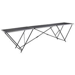 Cette table a treteau est dotee d'un cadre en aluminium resistant et leger et d'un dessus de table en MDF noir facile a nettoyer, avec une capacite de charge maximale de 30 kg. La table est equipee de pieds tubulaires en acier en forme de W pour la resistance et la durabilite et peut facilement etre pliee pour le stockage et le transport lorsqu'elle n'est pas utilisee.
