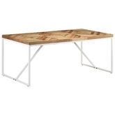 Fabriquee en bois massif d'acacia et de manguier, cette table de salle a manger est tres stable et durable. Les pieds en acier enduit de poudre blanc offrent une stabilite supplementaire. Le dessus de table robuste dispose d'un design en chevron et mosaïque, ce qui en fait une decoration speciale a votre interieur. Il peut egalement etre utilise pour placer des boissons ou des collations.