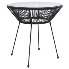 La table est en rotin de PVC rond resistant a l'eau et dessus en verre transparent trempe, ce qui la rend stable et facile a nettoyer. De plus, le cadre en acier enduit de poudre assure une stabilite supplementaire. Qu'elle soit utilisee seule ou en combinaison avec d'autres meubles, cette table s'assortit toujours parfaitement.