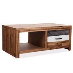 La table est fabriquee en bois d'acacia massif, ce qui la rend tres robuste et durable. La façade du tiroir a ete peinte en noir et blanc contraste, ce qui lui donne un aspect unique. Le couvercle robuste est ideal pour placer vos boissons, aliments, paniers de fruits ou autres objets decoratifs. Le tiroir et l'etagere offrent suffisamment d'espace pour ranger et mettre a portee de main toutes sortes d'objets, tels que livres, magazines et telecommandes. L'assemblage est facile.