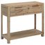 Cette table console est faite de bois d'acacia massif avec une finition brossee, de MDF et de placage d'acacia, ce qui la rend robuste et stable. La table console a un dessus robuste, sur lequel vous pouvez placer des objets decoratifs comme des corbeilles de fruits ou des vases. La tablette et les 2 tiroirs offrent suffisamment d'espace pour garder tous les types d'articles plus petits organises et a portee de main. Ce produit doit etre assemble.