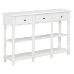 La table a un dessus de table en MDF solide sur lequel vous pouvez placer des objets decoratifs tels que des corbeilles a fruits ou des vases. Les pieds en bois de pin solide garantissent la stabilite et la durabilite, assurant des annees de service. De plus, les 3 tiroirs offrent un espace suffisant pour garder toutes sortes d'objets plus petits organises et a portee de main. Les 2 etageres offrent un espace supplementaire pour ranger vos chaussures et autres effets personnels.