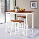 Cette table de bar est dotee d'un dessus de table en MDF et de pieds en bois massif. Les tabourets sont entierement faits de bois solide pour la robustesse et la durabilite. L'ensemble de bar a reçu une belle finition par ponçage, peinture et laquage pour lui donner un aspect raffine. La table et les tabourets sont faciles a nettoyer avec un chiffon humide. L'assemblage est facile.