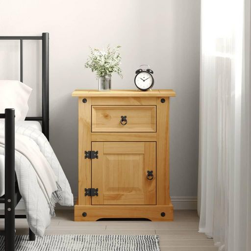 Cette table de chevet en bois de style est fabriquee en pin massif cire avec des details rustiques en metal noir et degage un charme mexicain qui en fera un excellent supplement a votre chambre a coucher ou salon.