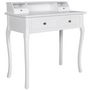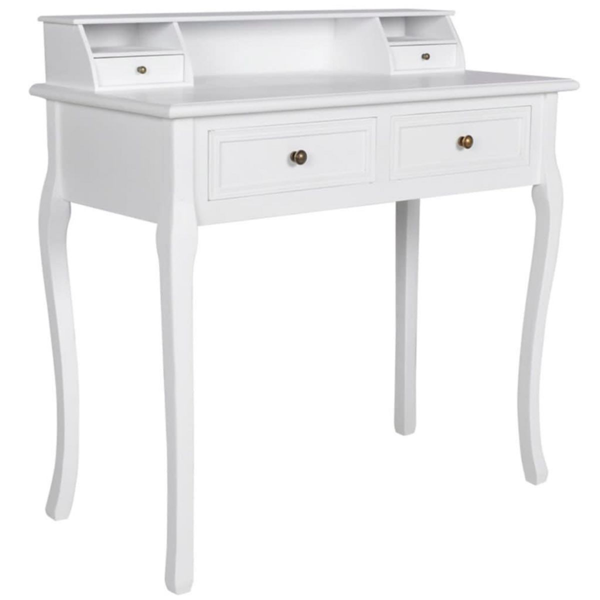 Cette jolie coiffeuse apportera une touche elegante a votre chambre a coucher ou loge! Il y a deux tiroirs supplementaires de chaque cote attenant au plateau de table pour accueillir vos objets de valeur. En outre, vous trouverez deux grands tiroirs sur la partie inferieure de la table pour l'espace de rangement supplementaire. Les tiroirs peuvent etre facilement enleves pour le nettoyage. La finition blanche douce et les jambes courbes elegantes fournissent le lustre et le luxe. La livraison comprend seulement une coiffeuse. Verifiez nos autres produits pour un tabouret, un miroir et autres! Veuillez noter que puisque ce meuble est fabrique a la main, fait de bois et peint en blanc, il peut venir avec un petit defaut.