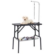 Cette table de toilettage pour animaux de compagnie est soutenue par des pieds en acier, ce qui la rend stable et robuste. Le grand plateau antiderapant cree une surface confortable sur laquelle vos animaux de compagnie peuvent se tenir debout. De plus, le bras de toilettage en acier inoxydable est reglable en hauteur. Ainsi, vous pouvez le regler a une hauteur parfaite en fonction de vous et de la taille de votre animal de compagnie. La table est pliable, ce qui est ideal pour les toiletteurs mobiles et un usage domestique car elle est facile a ranger. Il y a un panier sous la table, qui peut etre utilise pour ranger les articles quotidiens des animaux de compagnie. De plus, les coins arrondis evitent les blessures.