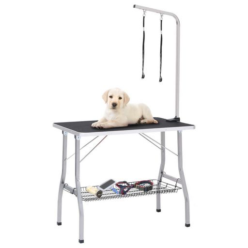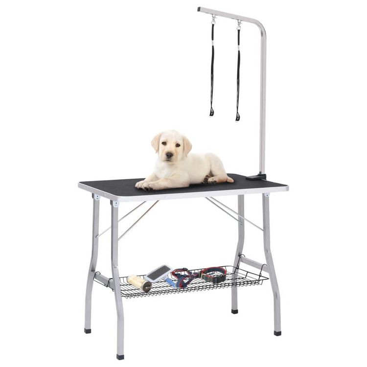 Table de toilettage reglable de chiens avec 2 boucles et panier
