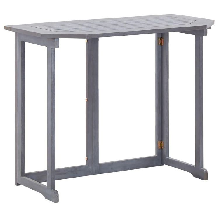 Fabriquee en bois d'acacia massif avec un lavis gris, notre table d'exterieur est durable, facile a entretenir et resistante aux intemperies. La table de balcon peut etre repliee pour economiser de l'espace lorsqu'elle n'est pas utilisee. Ce produit necessite un assemblage. Veuillez noter que le bois est un produit naturel et peut presenter des imperfections.