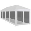 Fabriquee en acier enduit de poudre, cette tente de reception est extremement durable. Le revetement de toiture est en polyethylene de haute qualite, ce qui le rend resistant a l'eau et aux UV. La tente dispose de dix parois laterales en maille qui vous protegent des insectes nuisibles. Les deux des parois laterales ont une entree a fermeture eclair pour un acces facile. La tente de reception est facile a installer avec les accessoires de montage inclus.