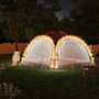 La tente de reception est faite de tissu 100 % polyester avec revetement PA, ce qui lui permet de resister aux UV. Le cadre est construit en fibre de verre robuste et est donc resistant a la rouille et egalement leger. Les quatre parois laterales moustiquaires incluses offrent une protection ideale contre toutes sortes d'insectes. Equipees d'une fermeture eclair, elles se fixent en quelques secondes. De plus, l'eclairage LED avec 96 LED peut etre facilement allume et eteint a la main, et le module solaire fourni charge la batterie integree pendant la journee.