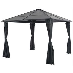 Le toit, compose de panneaux de PC resistant aux UV de 6 mm d'epaisseur, vous protege des rayons UV et des rayons UV nocifs. La tonnelle est solidement construite en aluminium et acier resistant et est par consequent resistante a la rouille et tres stable. Elle est livree avec 4 parois laterales, qui peuvent etre retirees par mauvais temps. Des attaches a boucles et a crochets sont egalement incluses pour une fixation facile des rideaux.