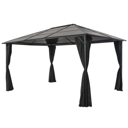 Le toit, compose de panneaux de PC resistant aux UV de 6 mm d'epaisseur, vous protege des rayons UV et des rayons UV nocifs. La tonnelle est solidement construite en aluminium et acier resistant et est par consequent resistante a la rouille et tres stable. Elle est livree avec 4 parois laterales, qui peuvent etre retirees par mauvais temps. Des attaches a boucles et a crochets sont egalement incluses pour une fixation facile des rideaux.