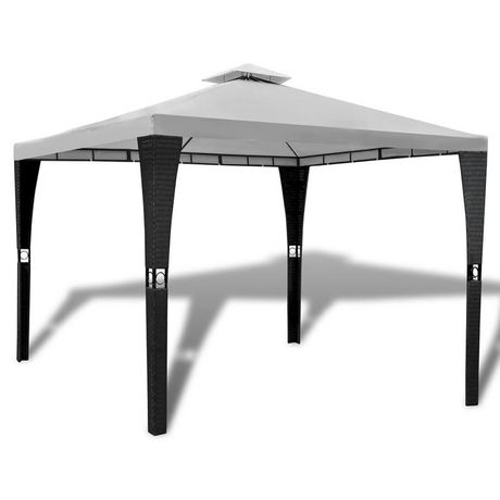 Le chassis leger et resistant a la rouille est en acier peint par poudrage. Le design en polyrotin tisse donne a cette tonnelle un look chic et attractif. Le toit en polyester resistant aux UV et a la dechirure est resistant a l'eau et tres durable. La construction a double toit permet a l'air de circuler lors des journees chaudes. Cette tonnelle est tres durable.