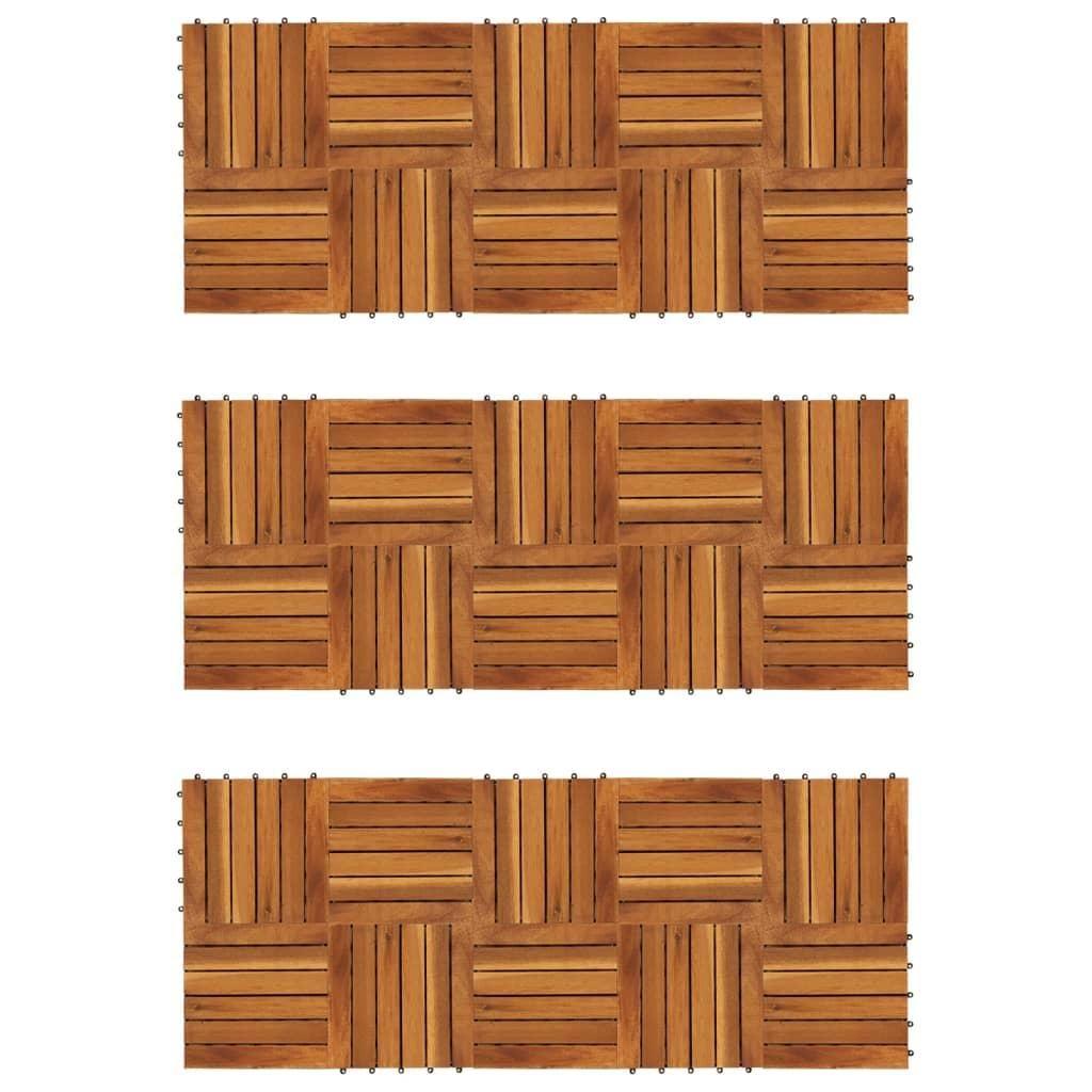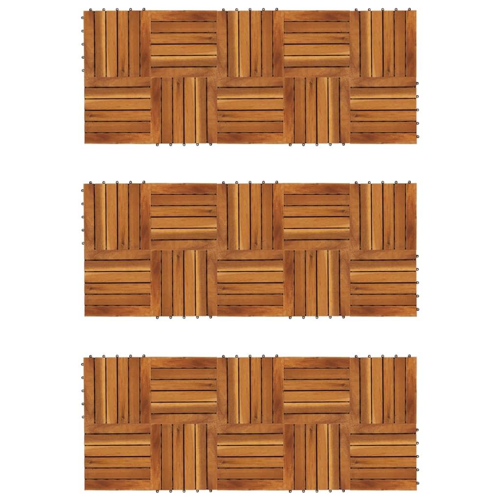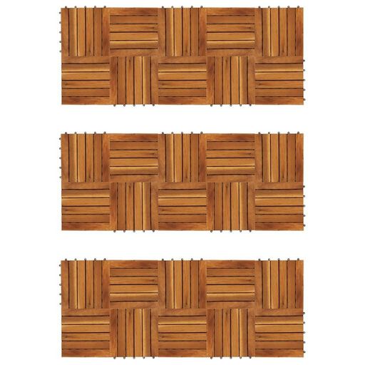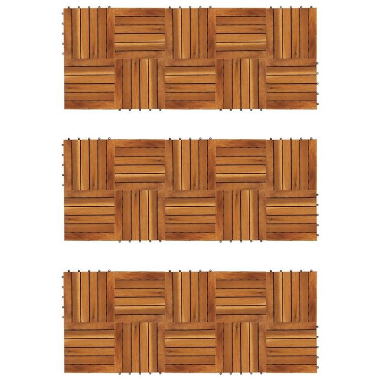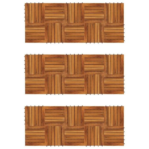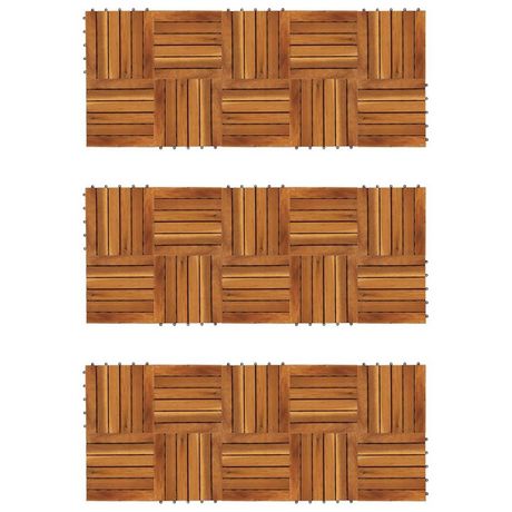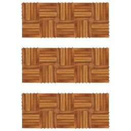Cet ensemble de 30 tuiles de terrasse en bois dur sera parfait pour orner les surfaces ou les allees dans votre jardin, sur votre terrasse ou balcon, ou dans toute autre piece. Le motif n'est pas seulement decoratif, mais ajoute une qualite antiderapante.