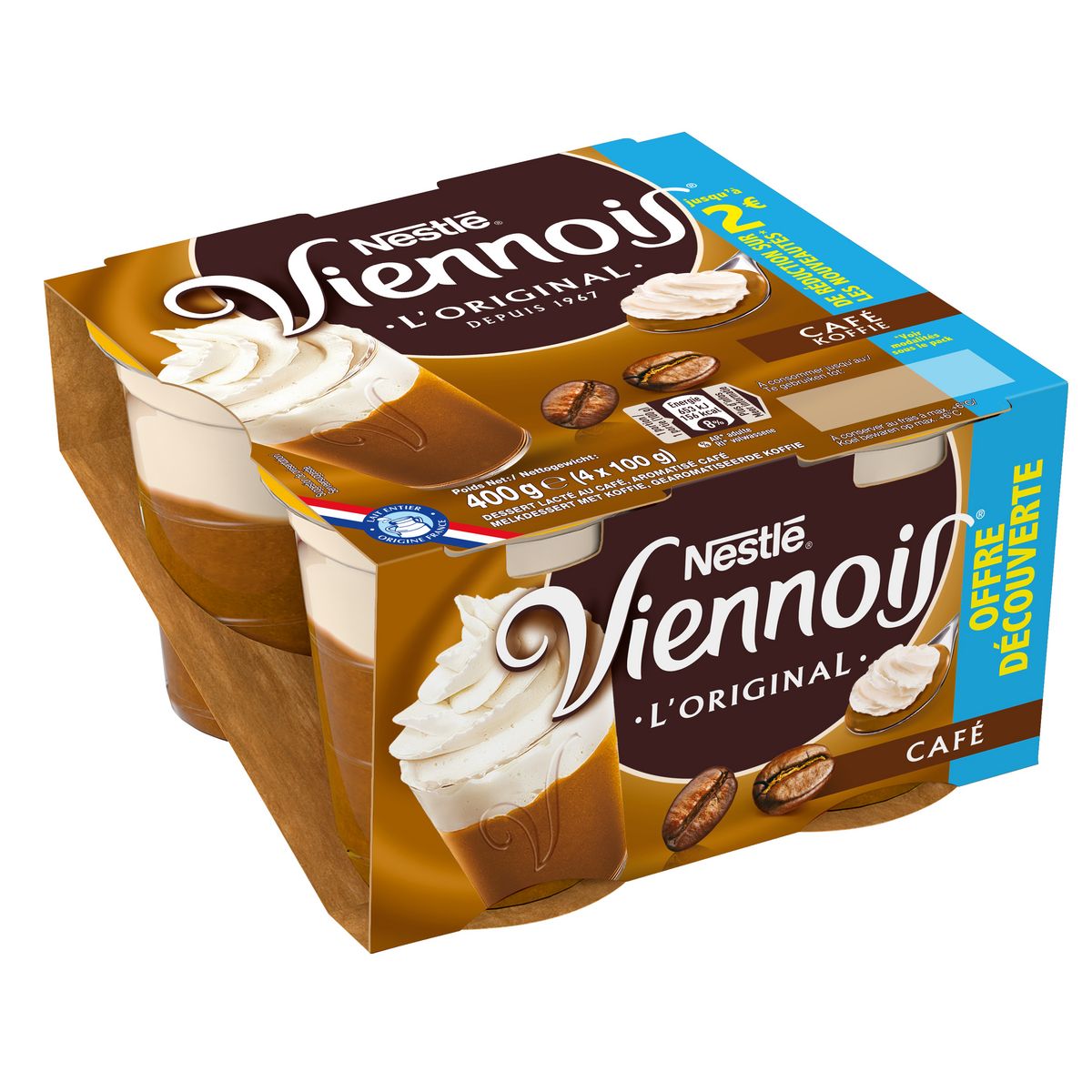 Le Viennois de Nestlé, c'est l'alliance parfaite entre une onctueuse crème dessert et un délicat tourbillon fouetté. C'est un dessert liégeois fabriqué en France avec du lait origine France.